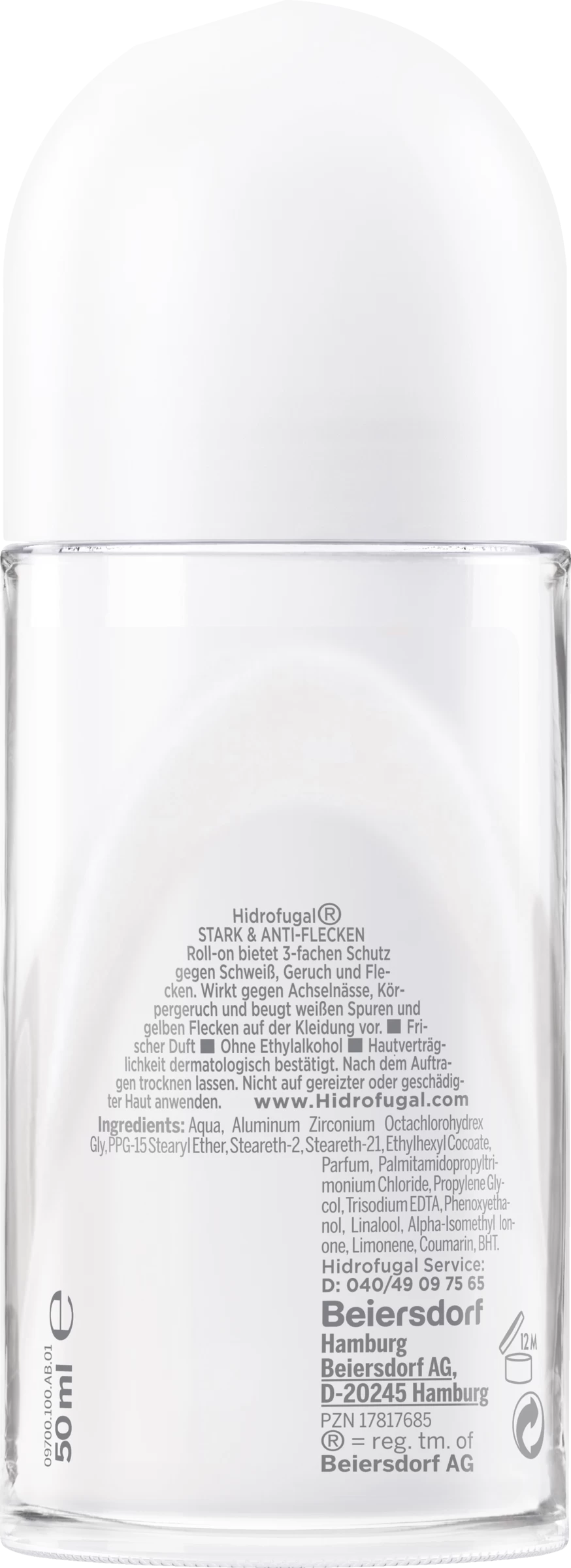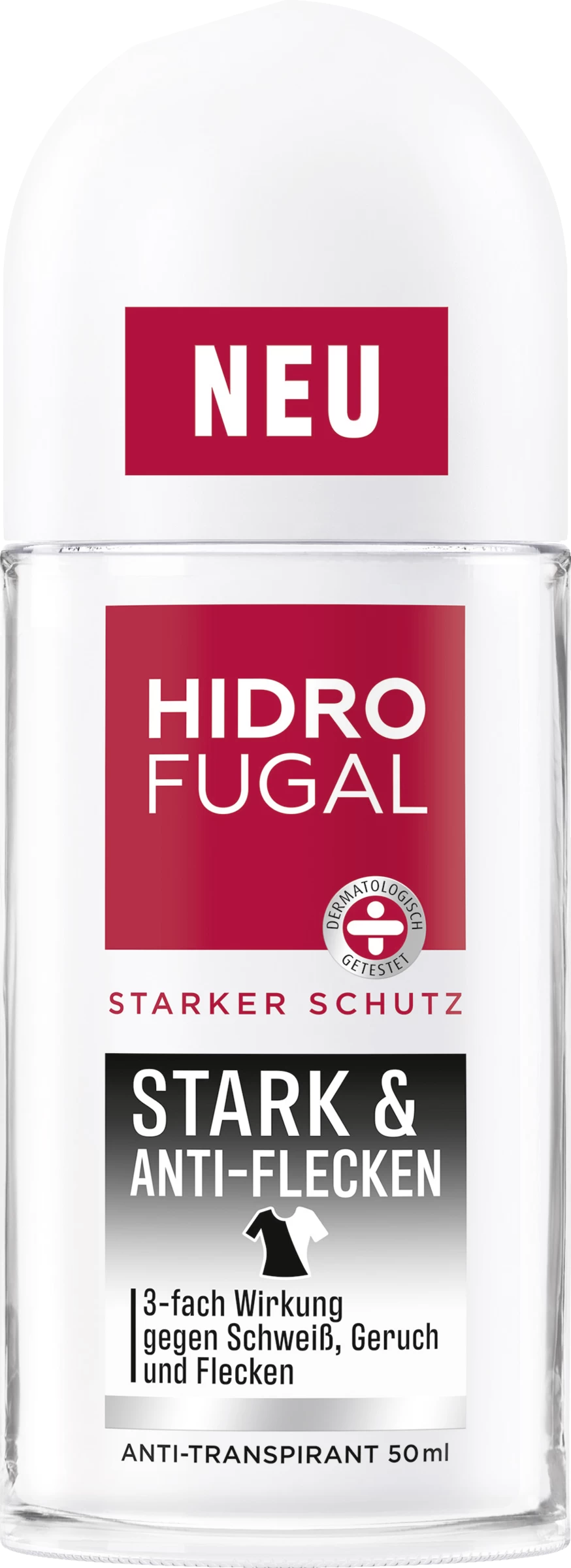 Dreifacher Schutz gegen Schweiß, Geruch und Flecken: Die speziell entwickelte Formel vom Hidrofugal STARK & ANTI-FLECKEN ROLL-ON wirkt zuverlässig gegen Achselnässe und Körpergeruch. Beugt gleichzeitig weißen Rückständen und gelben Flecken auf der Kleidung vor.