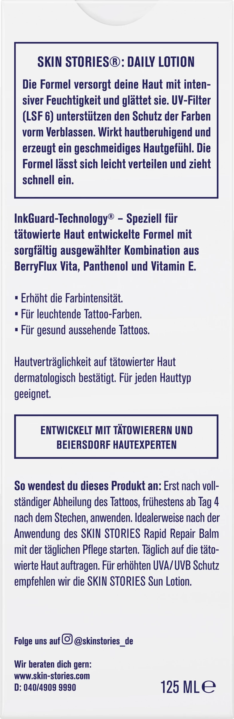 Die farberhaltende Lotion spendet Feuchtigkeit und erhöht die Farbintensität deines Tattoos. Dank der InkGuard-Technology® mit einer Wirkstoffkombination aus BerryFlux Vita, Panthenol und Vitamin E verbessert sie die Hautelastizität und glättet die Haut. UV-Filter mit LSF 6 schützen die Farben deines Tattoos im Alltag. Gleichzeitig lässt sich die hautberuhigende Lotion leicht verteilen, zieht schnell ein und hinterlässt ein geschmeidiges Hautgefühl.