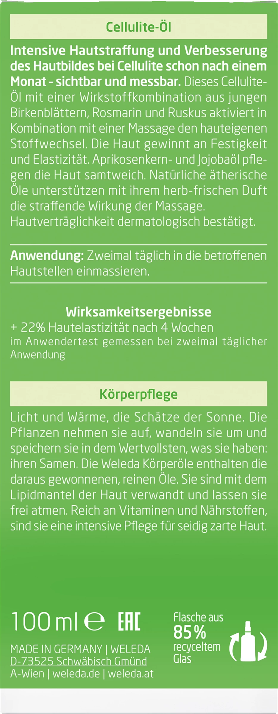 Das Birke Cellulite-Öl verleiht Ihrer Haut neue Spannkraft, macht sie glatter, straffer und verwöhnt mit einem herb-frischen Duft. Das 100 ml Birke Cellulite-Öl jetzt mit Spender.