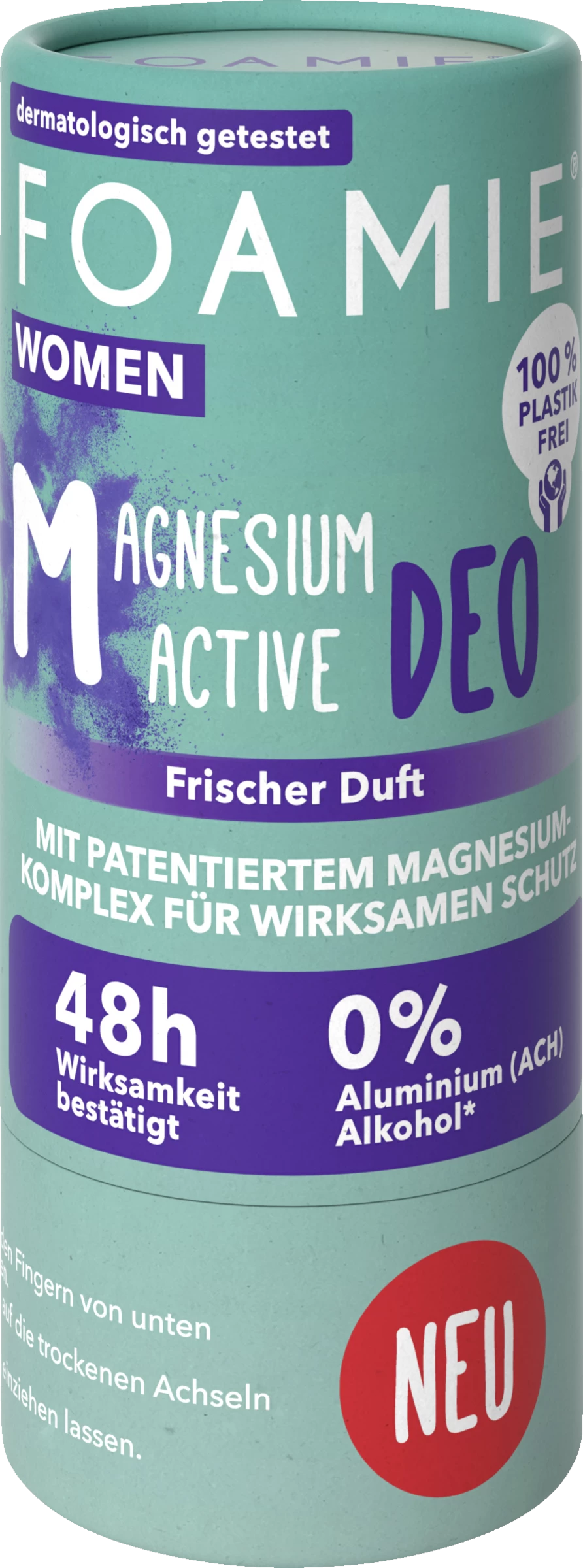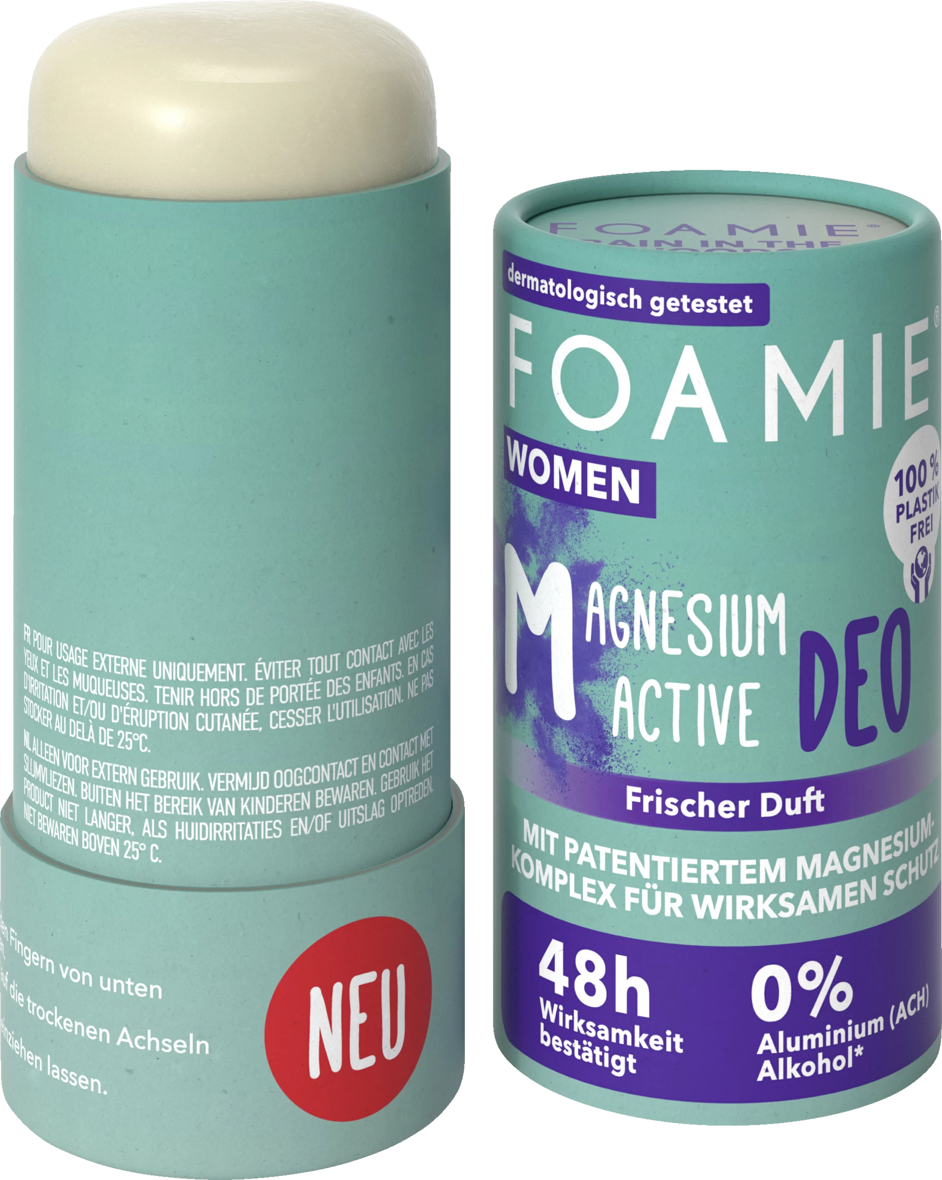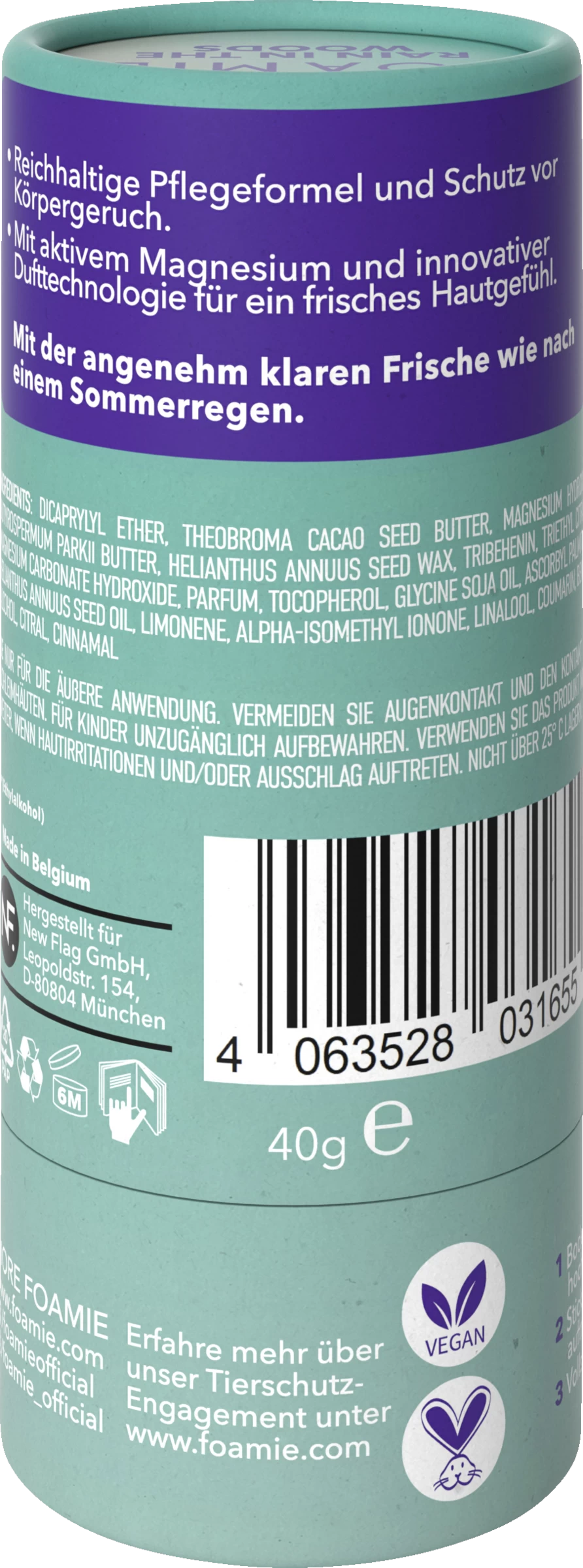 Foamie vervollständigt deine plastikfreie Pflegeroutine im Badezimmer mit dem NEUEN Festen Deodorant. Rain In The Woods für Frauen bietet dir nachhaltige und zugleich reichhaltige Pflege mit patentiertem Magnesiumkomplex und einem dezent-frischem Duft für ein anhaltendes frisches Hautgefühl. Der aktive Magnesiumkomplex kontrolliert das Wachstum und die Aktivität von Bakterien, bietet wirksamen Schutz gegen Körpergeruch und absorbiert Schweiß und Talg. Dadurch neutralisiert das Deodorant schlechte Gerüche für 48 Stunden ohne die natürliche Schweißproduktion zu blockieren. Der Stick ermöglicht eine einfache Anwendung – perfekt für zu Hause und auf Reisen.